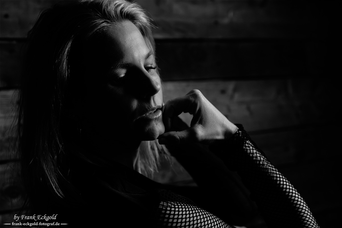 Sie sitzt im Halbdunkel, angelehnt an raues Holz, als hätte die Zeit für einen Moment innegehalten. Das Licht fällt nur sparsam in den Raum und zeichnet warme Linien über Haut und Konturen.