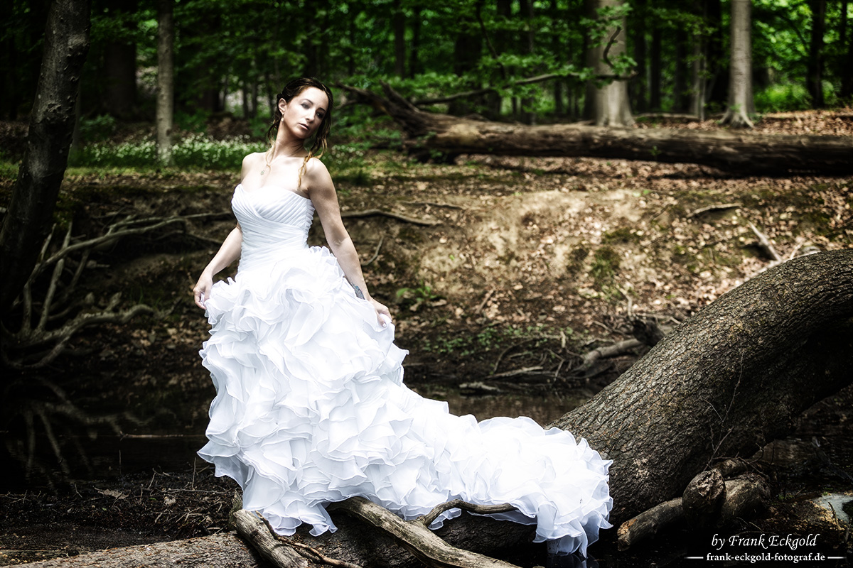 Mitten im stillen Grün des Waldes erscheint die Braut wie ein flüchtiger Traum zwischen Licht und Schatten. Das helle Kleid fließt über den alten Stamm, als hätte der Wald selbst den Stoff behutsam aufgefangen. Für einen Augenblick wirkt alles entschleunigt — als würde die Natur den Atem anhalten.