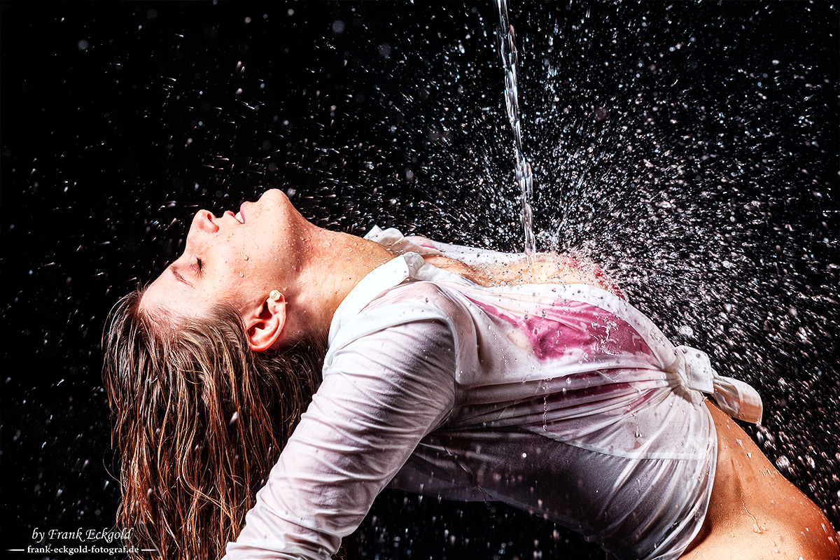 Das Wasser trifft auf den Körper, bricht sich in tausend Tropfen und verwandelt die Szene in ein Spiel aus Energie und Hingabe. Nichts wirkt kontrolliert, nichts gehalten – alles passiert genau jetzt.